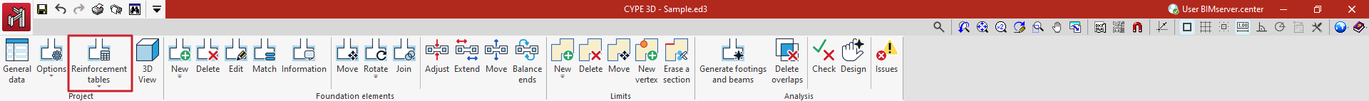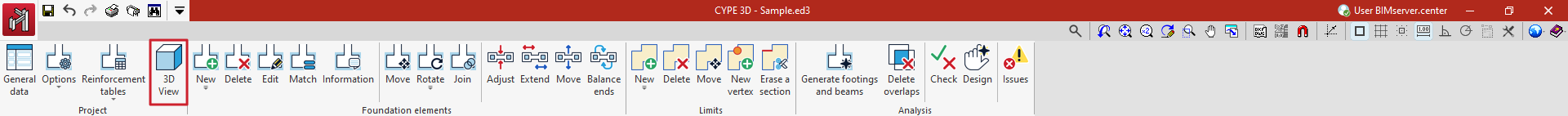 - Dans le bloc ‘Ouvrage’, les options pour définir les données générales de la fondation, ses options de calcul et de conception et les tableaux d'armature, ainsi que pour obtenir la vue 3D ;