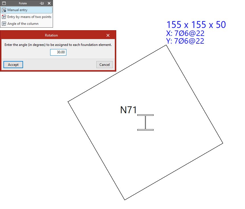 - Si vous choisissez ‘Introduction manuelle’, vous devez saisir un angle en degrés pour l'attribuer à l'élément de fondation. Après avoir cliqué sur ‘Accepter’, sélectionnez les éléments avec le bouton gauche et confirmez avec le bouton droit.