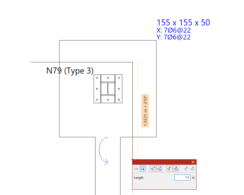 - En utilisant l’option ‘Angle du poteau’ puis en cliquant sur un élément de fondation, celui-ci prend automatiquement l'angle du poteau. S'il y a plusieurs poteaux, l'angle du premier poteau saisi est pris en compte.