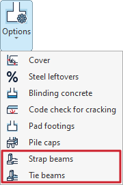 Les outils de configuration des poutres de redressement et de liaison sont disponibles dans le menu ‘Options’ du bloc ‘Ouvrage’ en haut de l'interface, dans l'onglet ‘Fondation’.
