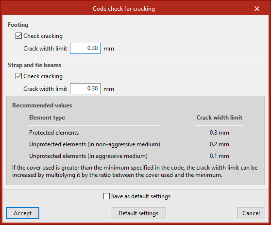 Le logiciel permet d'inscrire la valeur d’ouverture limite de fissures pour chaque cas. Dans la partie inférieure de la fenêtre, le logiciel propose un tableau avec les ‘Valeurs recommandées’ en fonction du ‘Type d'élément’, qui aide à déterminer la valeur de cette limite.