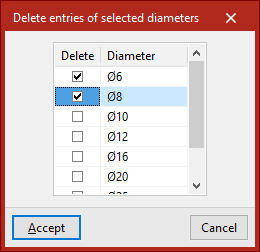 Le logiciel utilisera le premier diamètre de la liste qui est égal ou supérieur au ‘Diamètre minimal’ indiqué. Il faut également spécifier le nombre minimal de barres et l’effort normal minimal pour disposer cette armature, qui doit être dépassé par la valeur maximale de l'effort normal dans la combinaison de béton la plus défavorable.