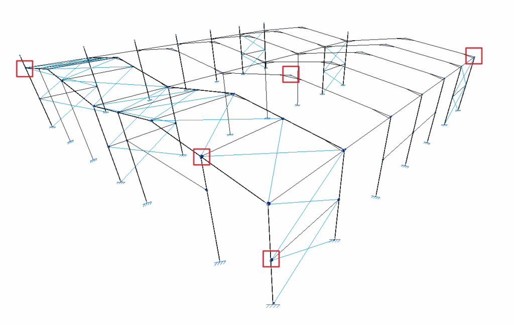 Dans le schéma de gauche, les éléments partiellement encastrés sont représentés par une ligne rouge les reliant au centre du nœud.