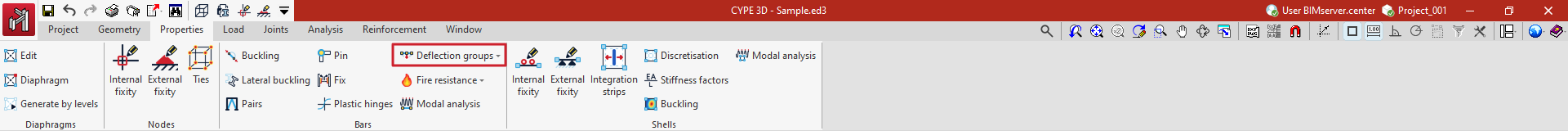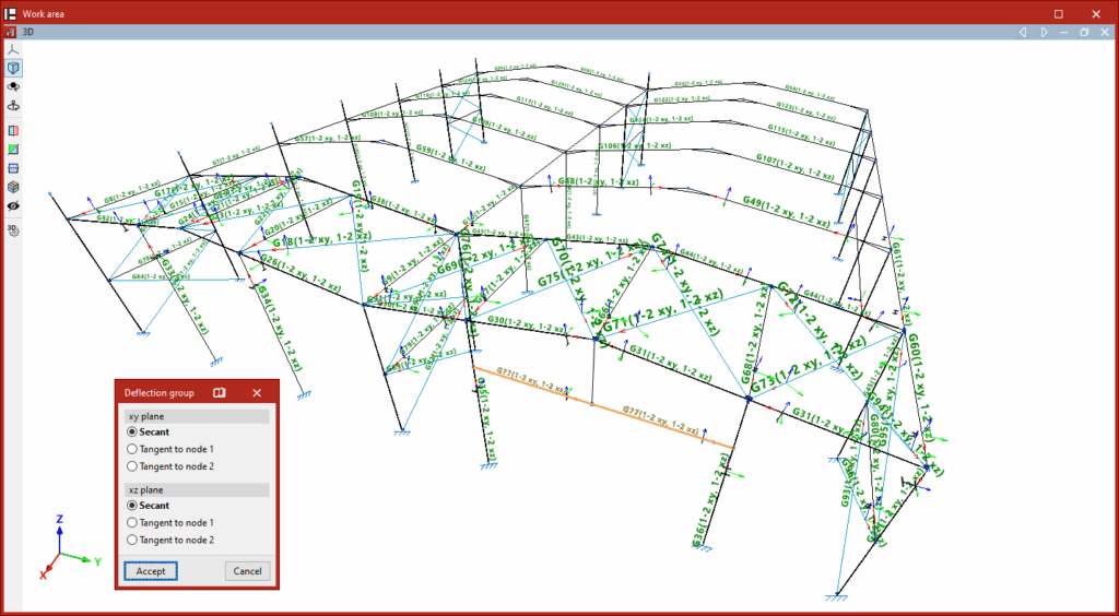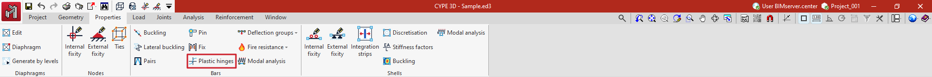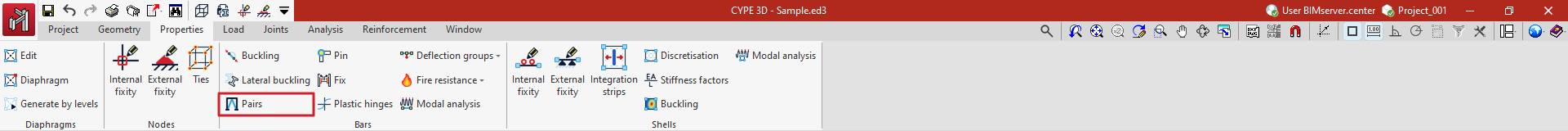 - Dans le bloc ‘Barres’, les options d'édition des propriétés des éléments, telles que celles relatives au flambement et au déversement, ou l'introduction de paires de contreventements, d’articulations et d’encastrements aux extrémités, de rotules plastiques et de groupes de flèches ;