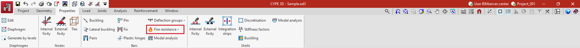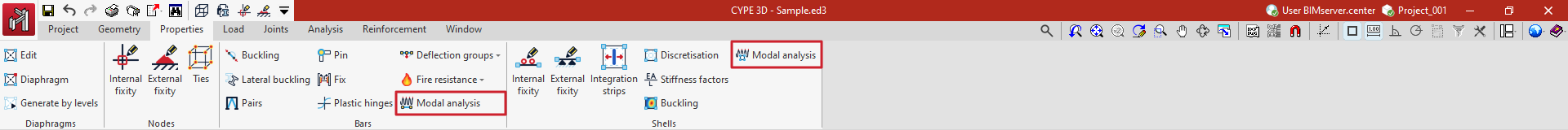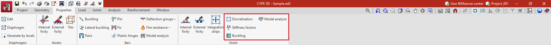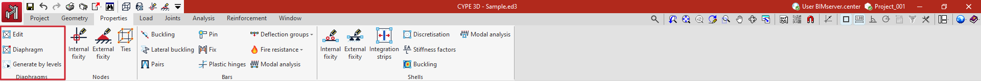 La génération et l’édition des diaphragmes rigides s'effectuent à l'aide des options disponibles dans le bloc ‘Diaphragmes’ de la barre d'outils supérieure, dans l'onglet ‘Propriétés’ (accessible depuis l’onglet inférieur ‘Structure’).