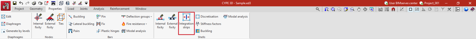 L'introduction et l'édition des bandes d'intégration des efforts dans les plaques s'effectuent à l'aide de l'option ‘Bandes d'intégration’, disponible dans le bloc ‘Plaques’ de la barre d'outils supérieure, dans l'onglet ‘Propriétés’ (accessible depuis l'onglet infñerieur ‘Structure’).