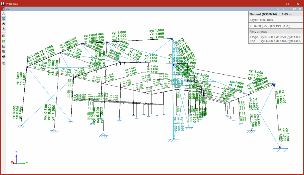 L'option ‘Nœud encastré avec coefficient d'encastrement partiel pour toutes les pièces’ permet de saisir le coefficient d'encastrement partiel (‘Coef.Enc.Part.’) qui définit le degré d'encastrement entre les pièces qui arrivent au nœud. La valeur peut être comprise entre 0, qui correspond à une articulation, et une valeur très élevée, qui correspond à un encastrement.