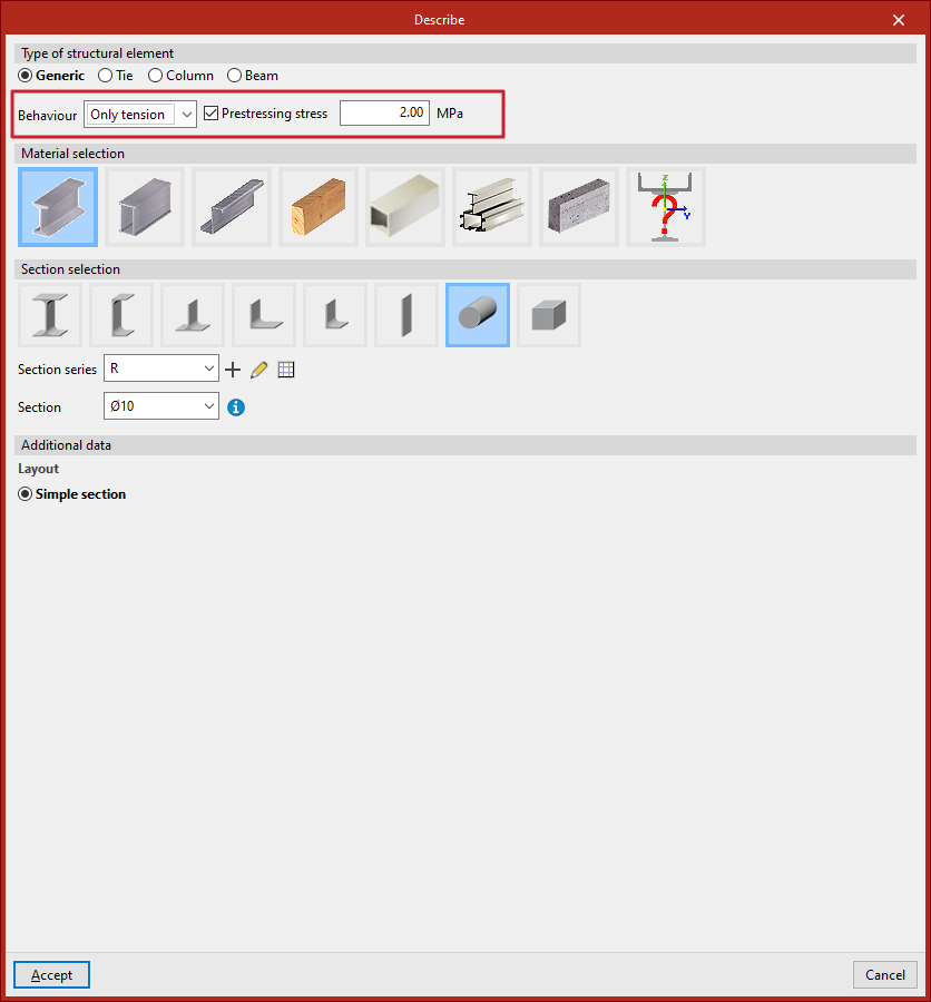 Pour prendre en compte une barre qui fonctionne uniquement en traction, dans la fenêtre ‘Décrire’ qui apparaît lors de l'édition de votre section, vous devez saisir une barre de type ‘Générique’ et, dans l'option ‘Comportement’, sélectionner la valeur ‘Seulement traction’.