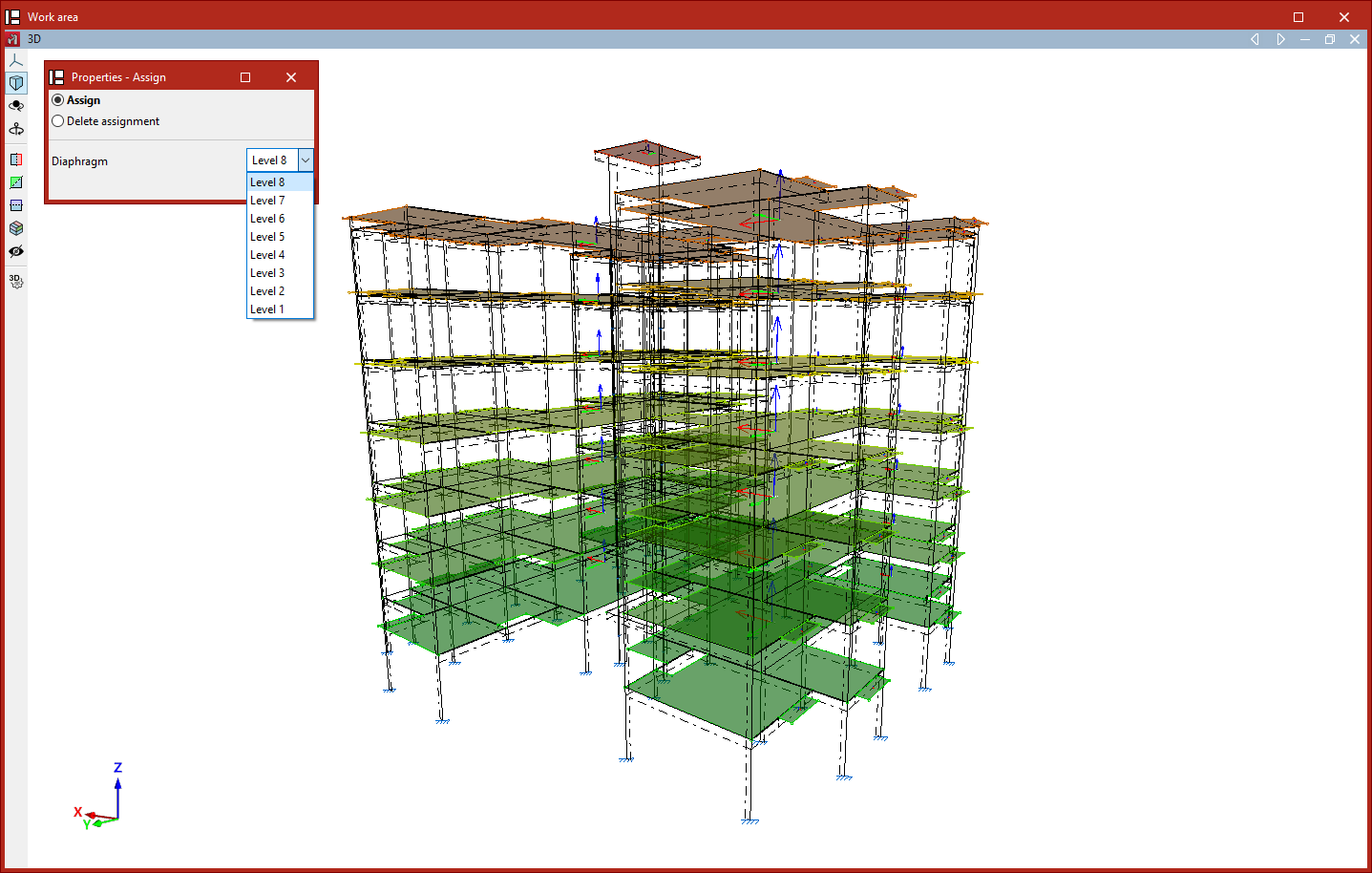 Si des niveaux ont été définis dans l'ouvrage (via l'option ‘Niveaux’ dans le menu ‘Plans’ de l'onglet ‘Géométrie’), cet outil génère automatiquement un diaphragme pour chaque niveau et attribue ce diaphragme à tous les nœuds du niveau.