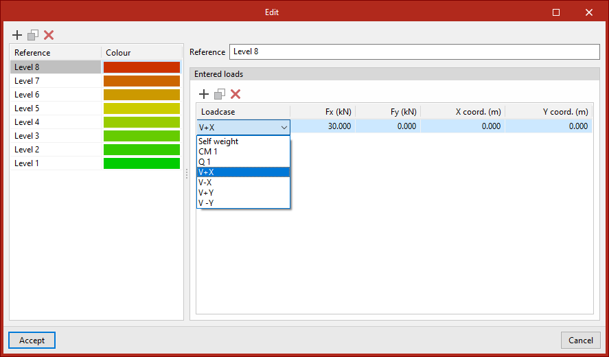De plus, des charges peuvent être définies pour chaque diaphragme. Pour ce faire, dans le tableau ‘Charges introduites’, vous pouvez sélectionner l'hypothèse, la charge dans la direction X globale (‘Fx’), la charge dans la direction Y globale (‘Fy’) et les coordonnées du point d'application (‘Coord. x’ et ‘Coord. y’).