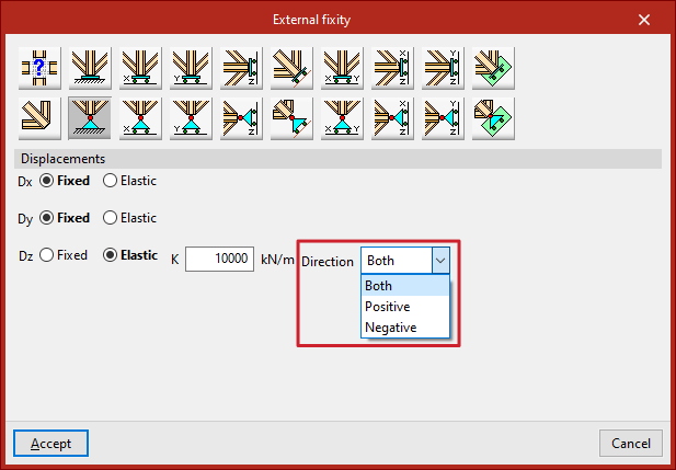 - S’il est ‘Élastique’, le logiciel suppose un appui élastique dans cette direction. À droite, la constante élastique de l'appui est écrite dans les unités indiquées, et son ‘Sens’ est spécifié (il peut agir dans les ‘Deux’ sens ou seulement dans les sens ‘Négatif’ ou ‘Positif’).