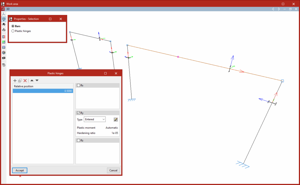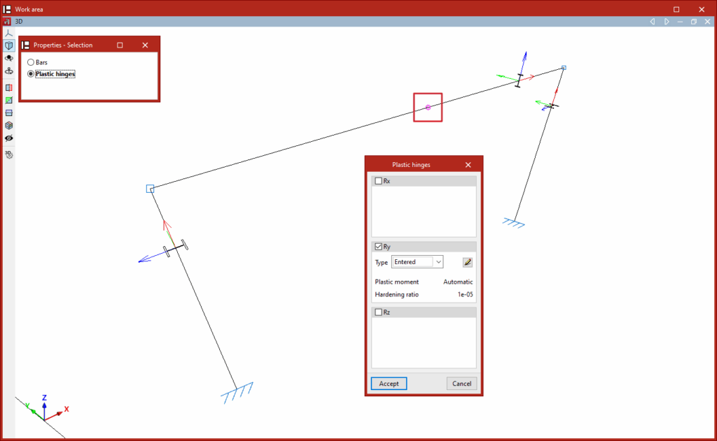 L'option ‘Articulation’ empêche uniquement les ‘Déplacements’ (Dx, Dy et Dz) dans les trois directions du nœud sélectionné, autorisant ainsi les rotations.