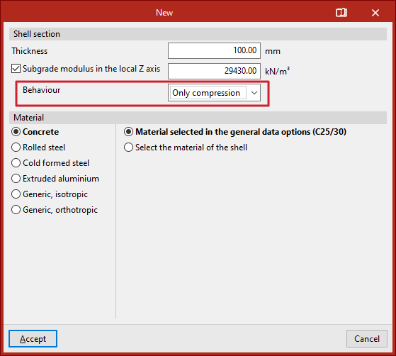 - Dans les plaques avec ‘Module de réaction sur Z local’, il est possible d'indiquer si le ‘Comportement’ est ‘Linéaire’ ou en ‘Compression uniquement’.