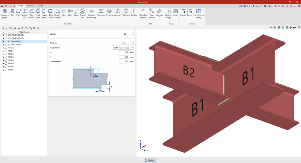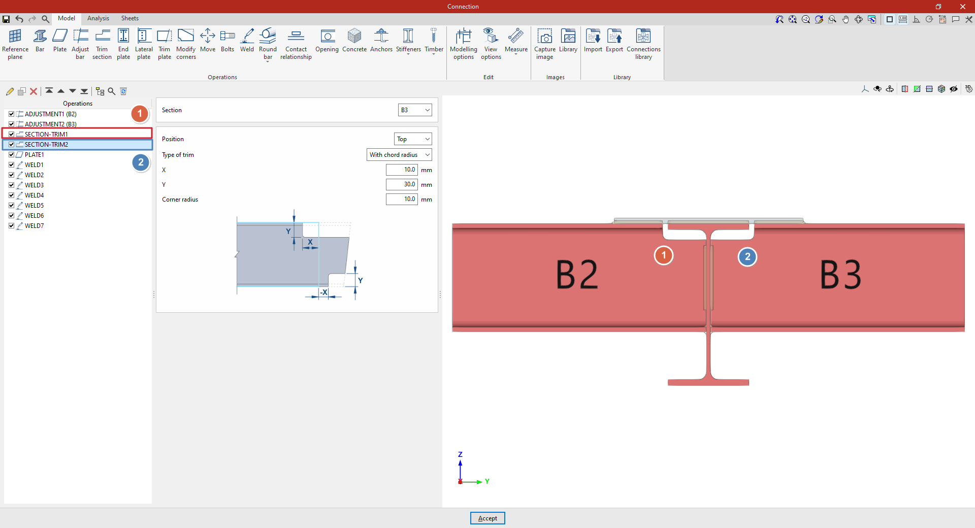 - Dans la première découpe, choisissez l'une des poutres secondaires, B2. La position de la découpe est ‘Supérieure’, car la découpe doit être effectuée dans la partie supérieure du profilé. Utilisez une découpe ‘Avec rayon de congé’, avec une dimension X de 10 millimètres, une dimension Y de 30 millimètres et un rayon de 10 millimètres.