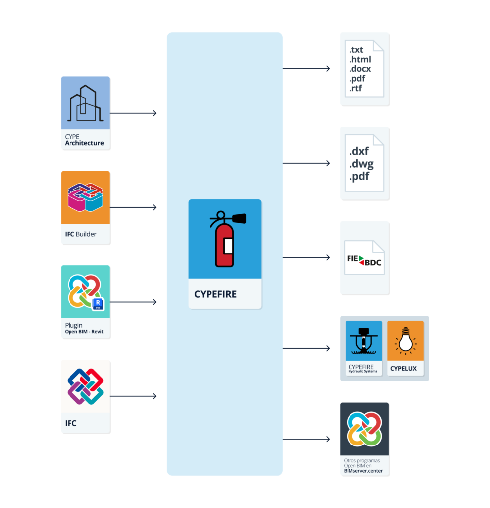 - Exportation des informations contenues dans CYPEFIRE vers la plateforme BIMserver.center via des formats IFC. Elles peuvent ainsi être visualisées par les intervenants autorisés du projet. Les informations générées par CYPEFIRE peuvent être utilisées par les logiciels suivants :
