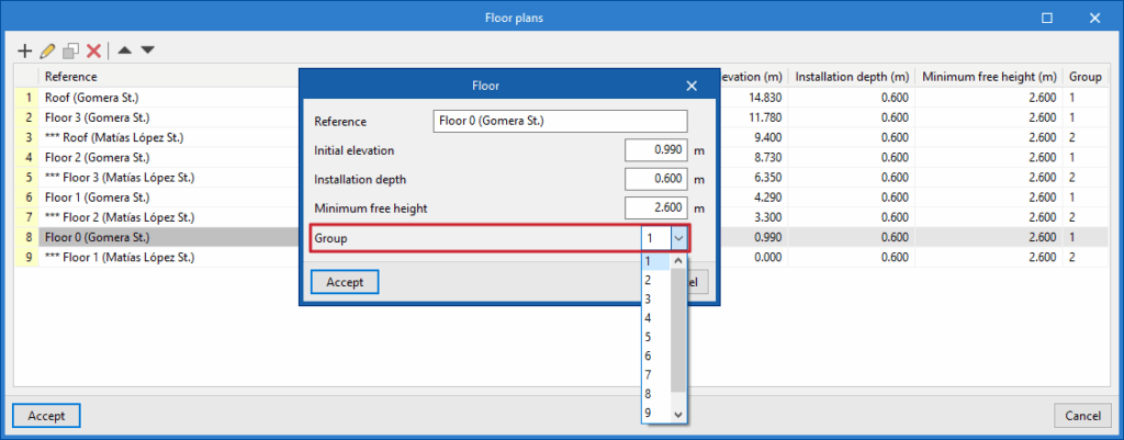 - (Optionnel) S’ils n'ont pas été lus à partir du modèle BIM, définition des plans de niveau (depuis ‘Projet’, ‘Plans de niveau’).