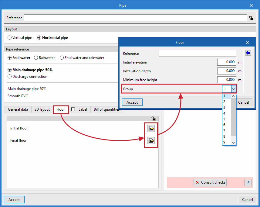 Ces options permettent de saisir librement les éléments du schéma de l’installation d'évacuation des eaux, en définissant les paramètres suivants :