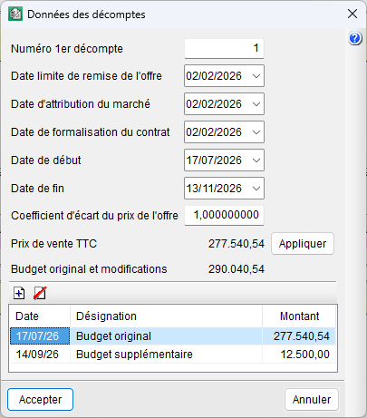 - Dates initiale et finale :définissent la période d'exécution prévue.