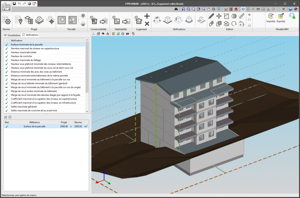 Le logiciel permet également d'exporter le modèle BIM d'urbanisme avec les vérifications au format IFC pour être ensuite vérifié par une visionneuse BIM, par exemple Open BIM Model Checker.