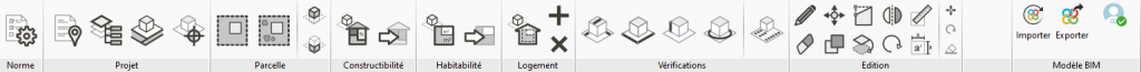 Cette barre comporte deux onglets aux fonctionnalités différentes. L'onglet ‘Visualisation’ permet de gérer le type de vue ainsi que la visibilité des éléments du bâtiment et de ses vérifications des règles d'urbanisme. L'onglet ‘Vérifications’ permet d'accéder au récapitulatif de vérifications de la réglementation appliquée.