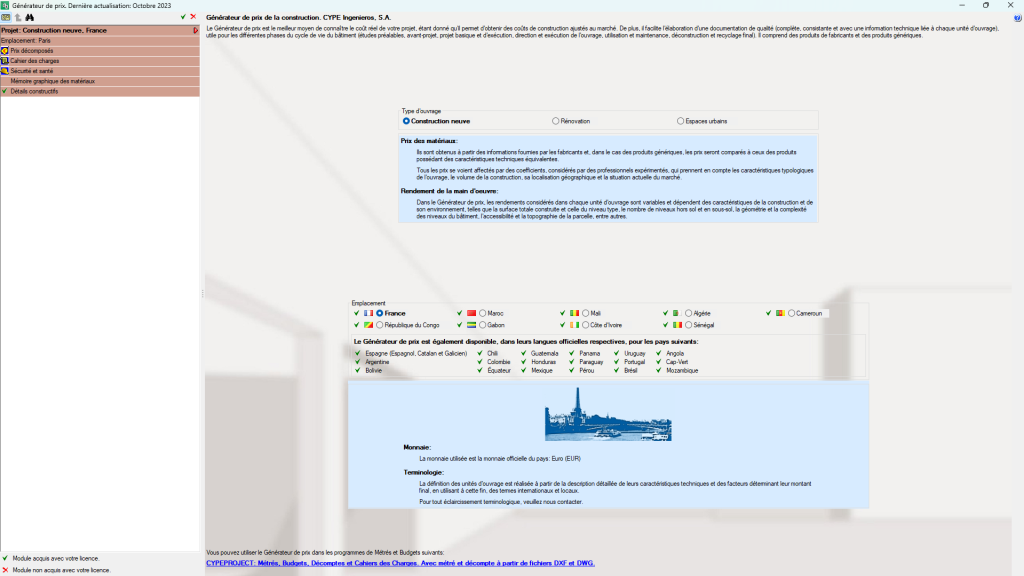 | L'exportation vers CYPEPROJECT ne sera possible que si le module Connexion avec le Générateur de prix du pays correspondant est disponible. Les unités d'ouvrage comprennent, outre le prix décomposé, les informations qui lui sont associées (informations graphiques, documents joints, cahier des charges, informations techniques, etc.). |