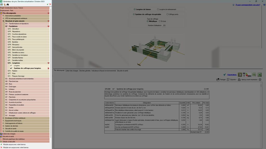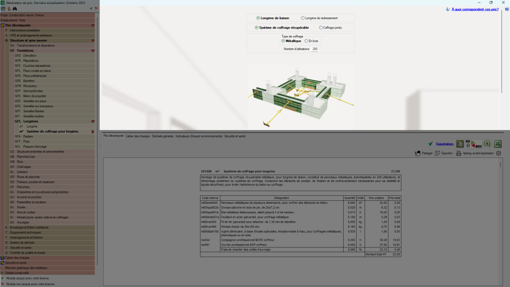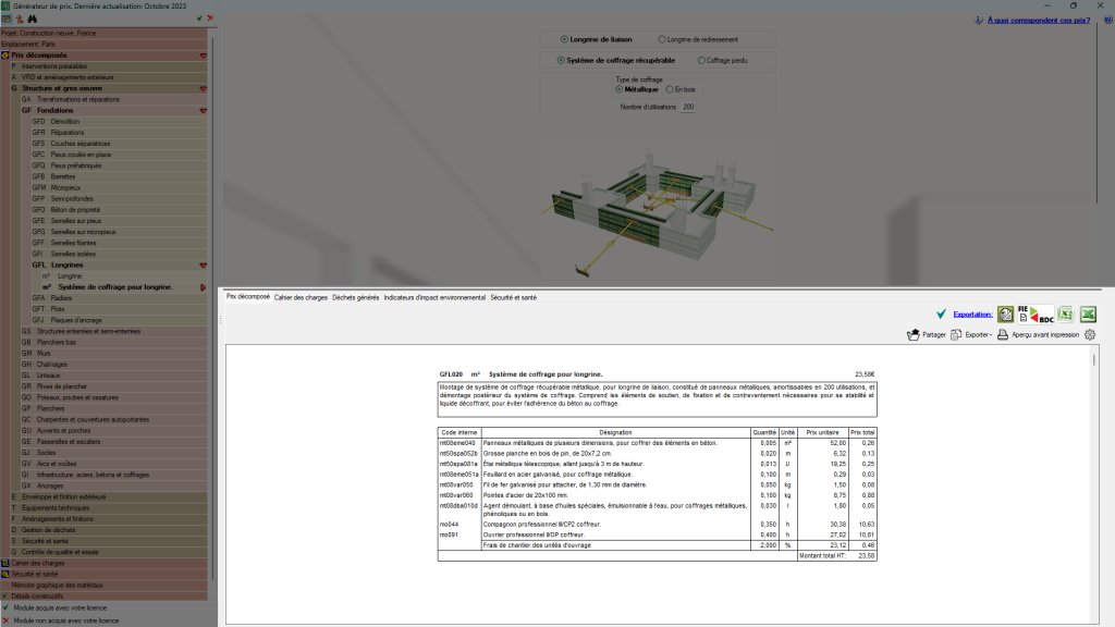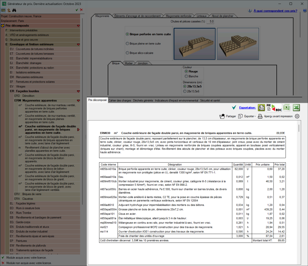 L'unité d’ouvrage peut être visualisée avec sa décomposition, dans la zone centrale, ou exportée à partir des outils dans le coin supérieur droit.