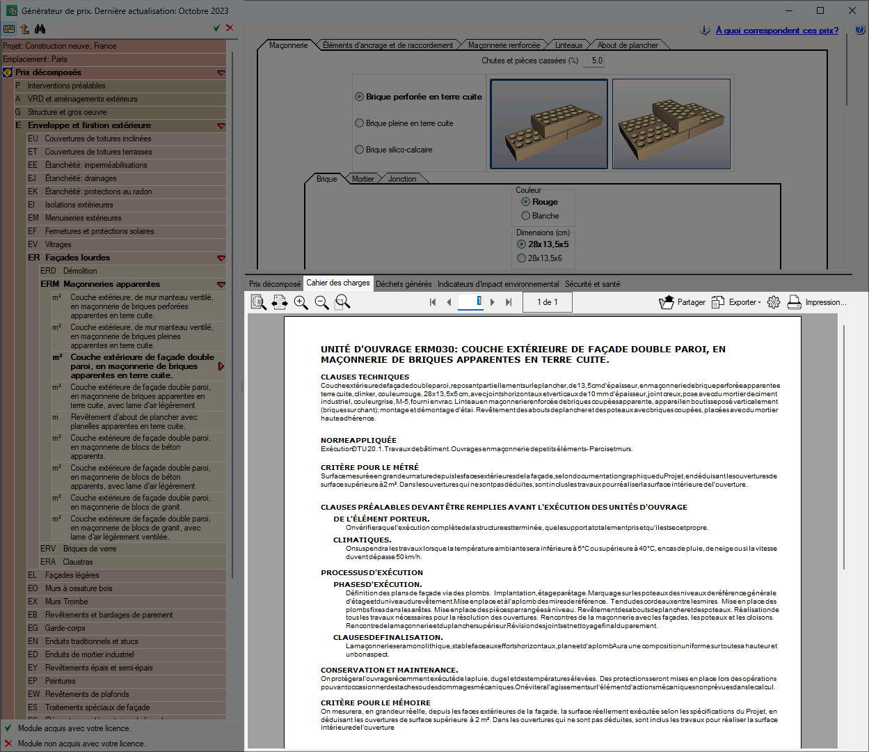 L'interface de cette section est subdivisée en trois parties. À gauche se trouve le menu latéral en arborescence et à droite, à son tour divisé en deux, se trouve le système de choix paramétrique en haut, et l'unité d’ouvrage sélectionnée en bas.