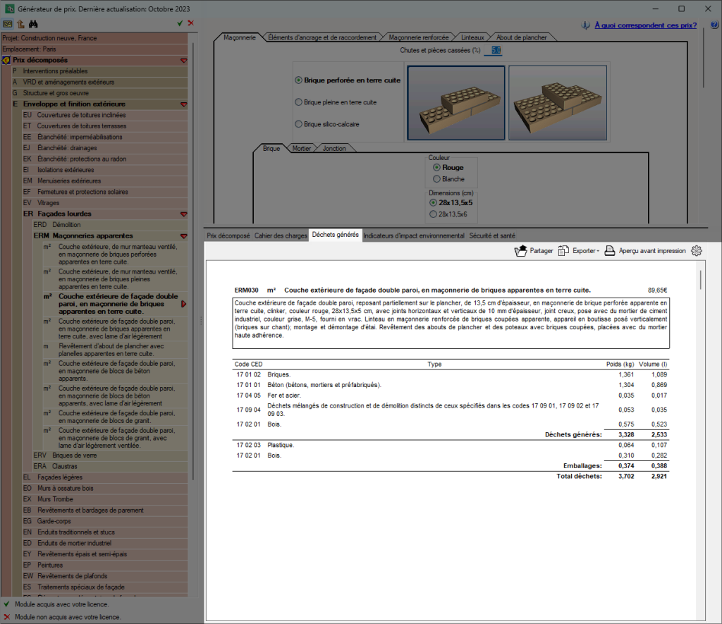 - Identification des déchets d’emballages : Outre les déchets directement liés à l’unité d’ouvrage, les déchets générés par les emballages associés sont indiqués. De nouveau, ils sont classés par type et une estimation du poids et du volume est fournie.