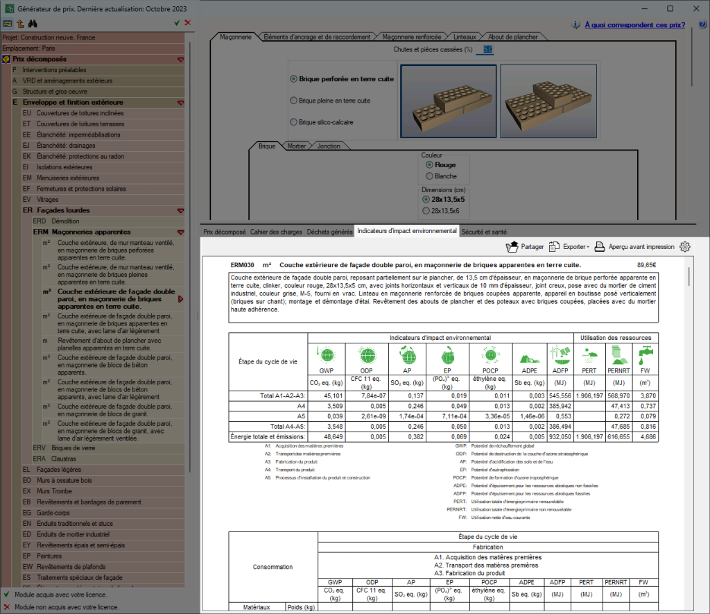 - Étapes du cycle de vie : Les impacts sont détaillés selon les différentes étapes, telles que l'achat de matières premières, le transport, la fabrication ou la construction, entre autres.
