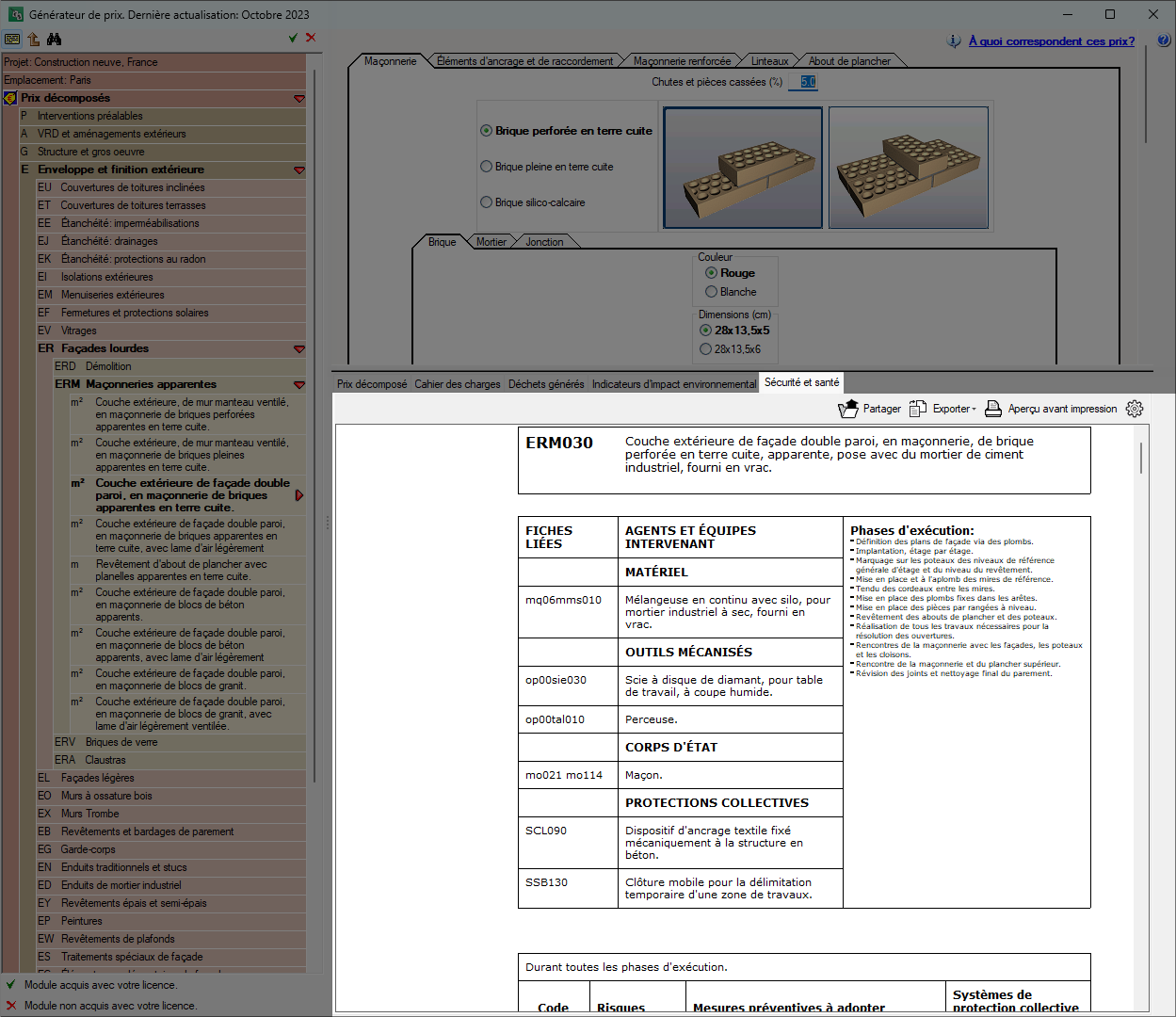 - Description, décomposition et coût de l'unité d’ouvrage : le code de l'unité, de l'unité de métré, le résumé, le prix, la description et la décomposition détaillée du prix unitaire en ses différents composants (matériaux, matériel, main-d'œuvre, % moyens auxiliaires, entre autres) sont présentés ;