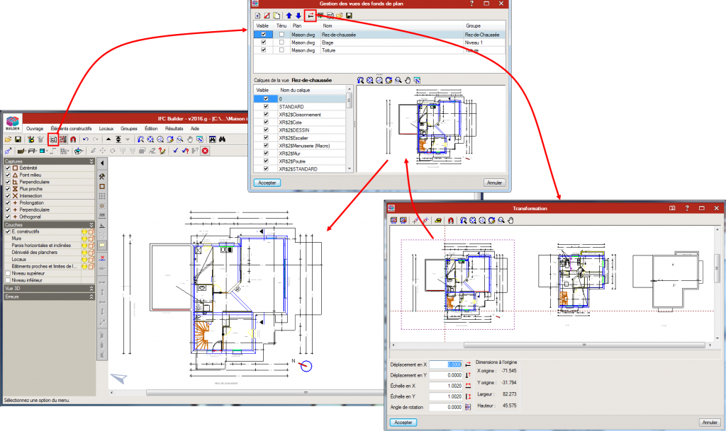 A modelação do edifício no IFC Builder pode ser realizada de raiz, com ou sem a ajuda de plantas no formato DXF, DWG, JPEG ou BMP. A utilização das plantas facilita a introdução manual dos dados.