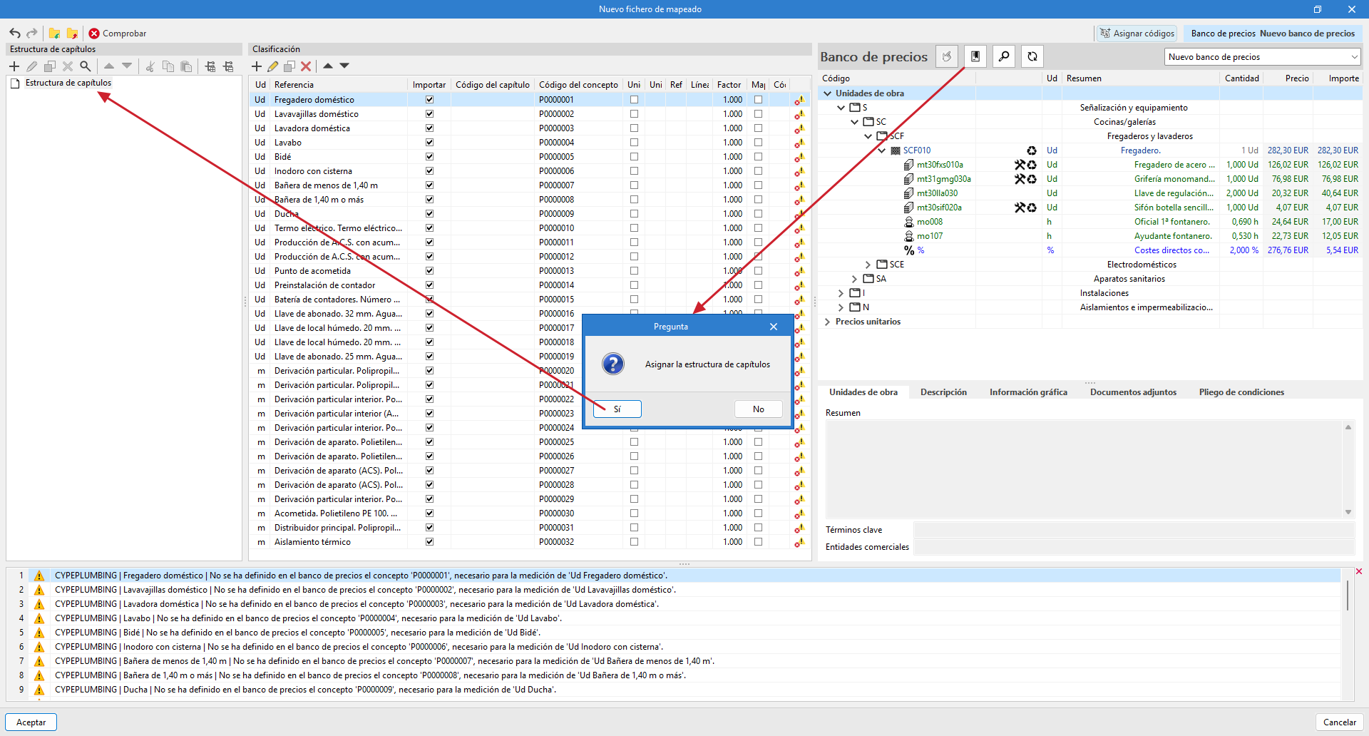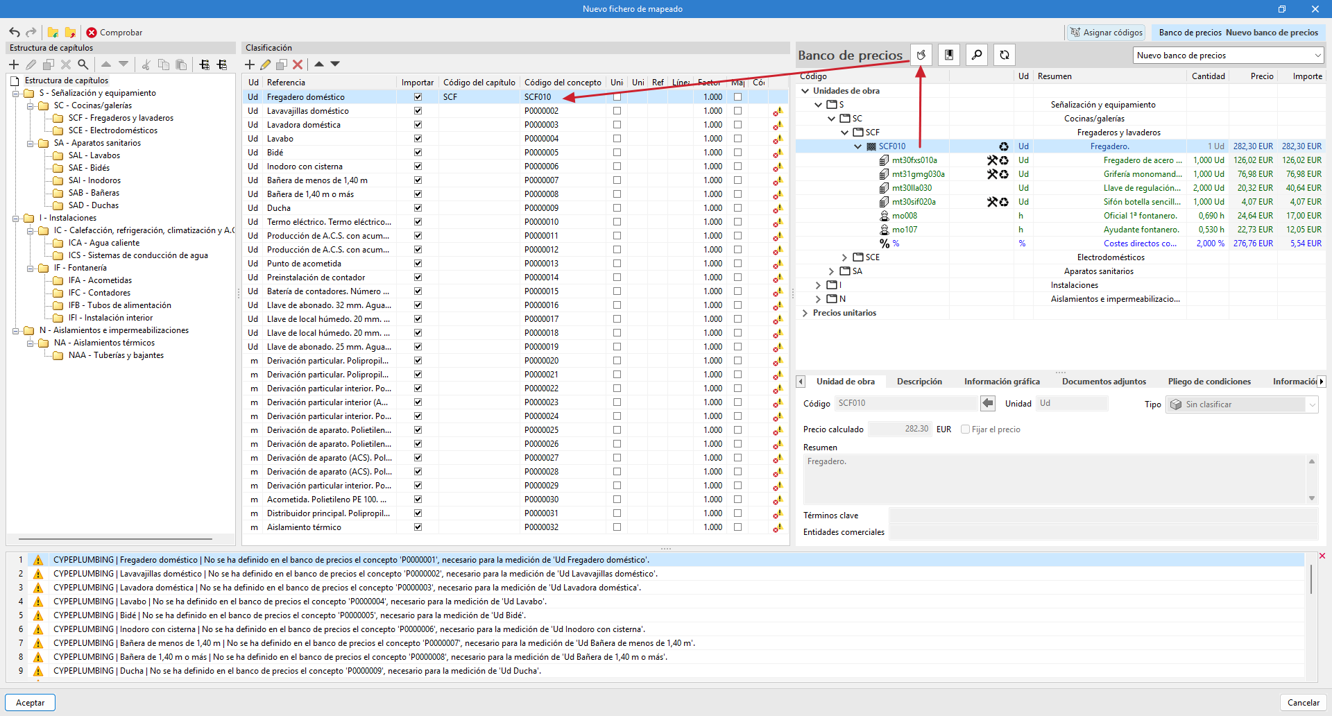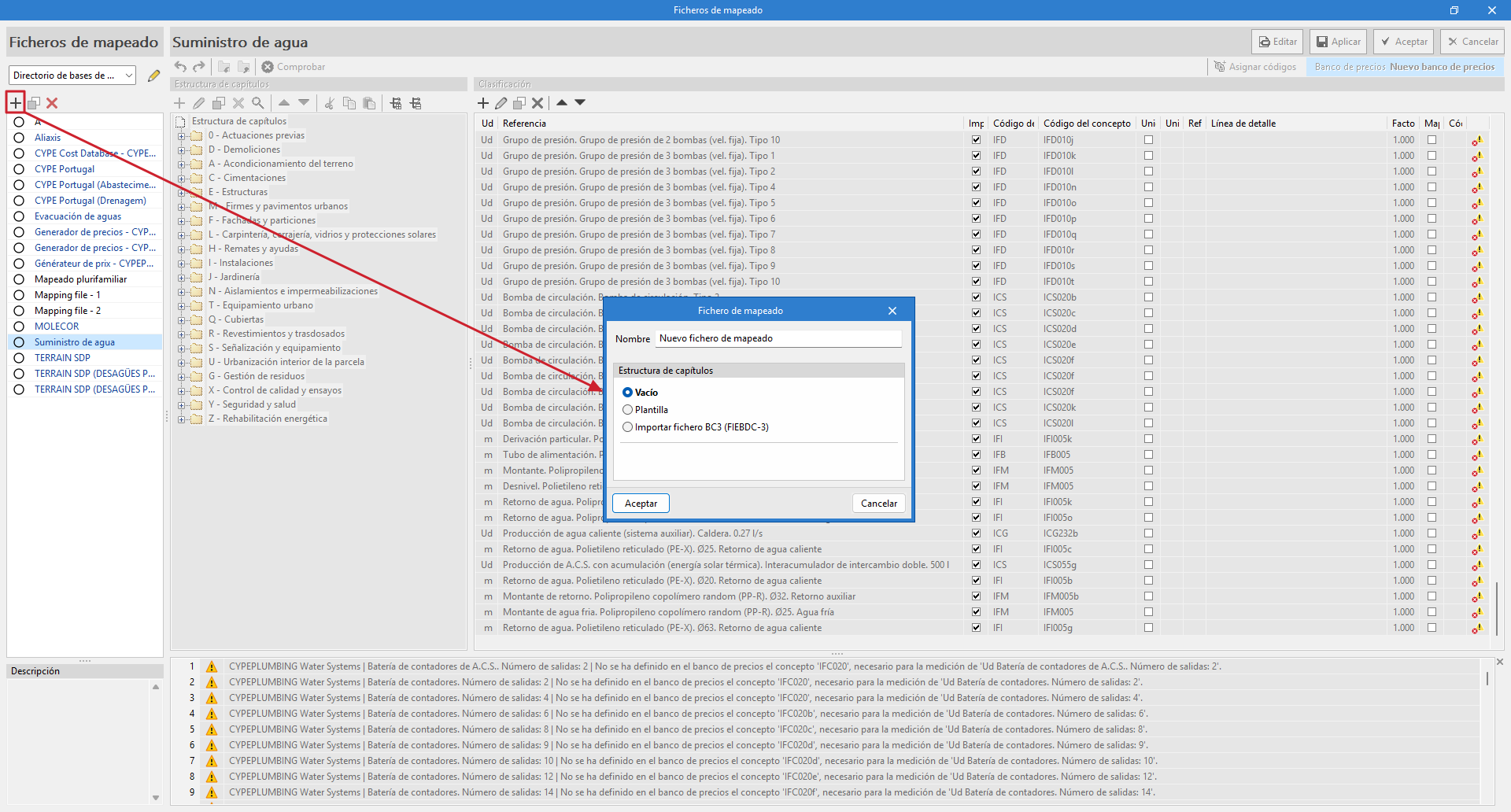 - Créez le mappage en important le fichier BC3 exporté depuis Arquímedes (depuis « Projet », « Mappage », « Ajouter », « Importer fichier BC3 »). De cette manière, la même structure de chapitres créée dans Arquímedes est générée.