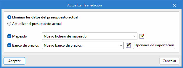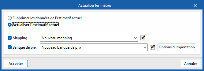 Dans ces cas, il est nécessaire de cocher l'option « Actualiser l'estimatif actuel », d'activer et de sélectionner le mappage et la base de prix, puis de cliquer sur Accepter.