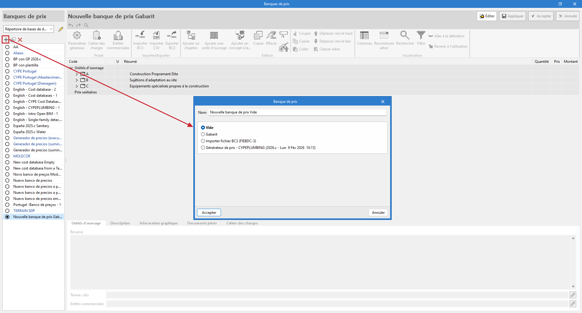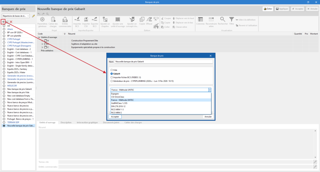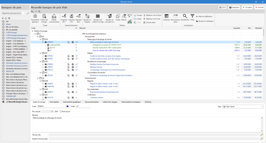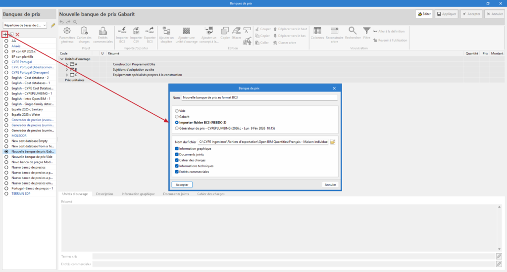 - (Facultatif) Importer une banque de prix au format BC3 (« Importer fichier BC3 »).