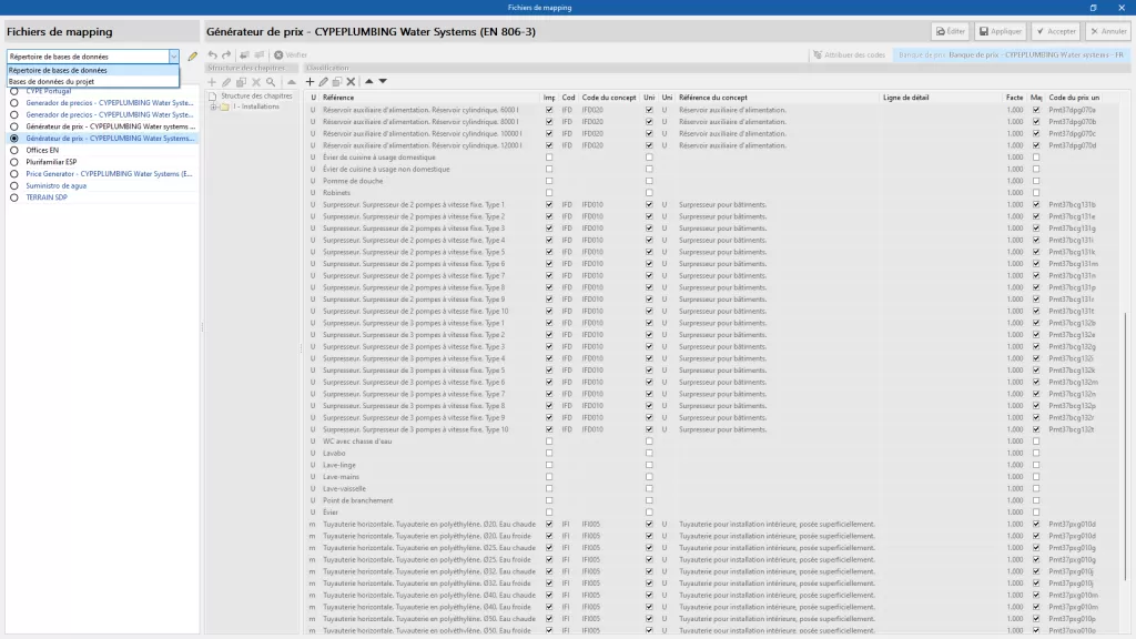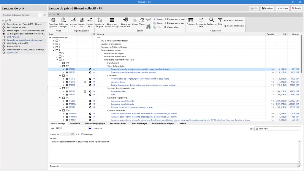 Pour faciliter l'introduction des prix de l'ouvrage, il est possible d'importer à la fois des bases de données complètes et des concepts individuels provenant de banques de prix qui ont été développées selon le format standard FIEBDC-3, ainsi que le Générateur de prix de CYPE. Il est également possible d'importer des banques de prix au format CSV.