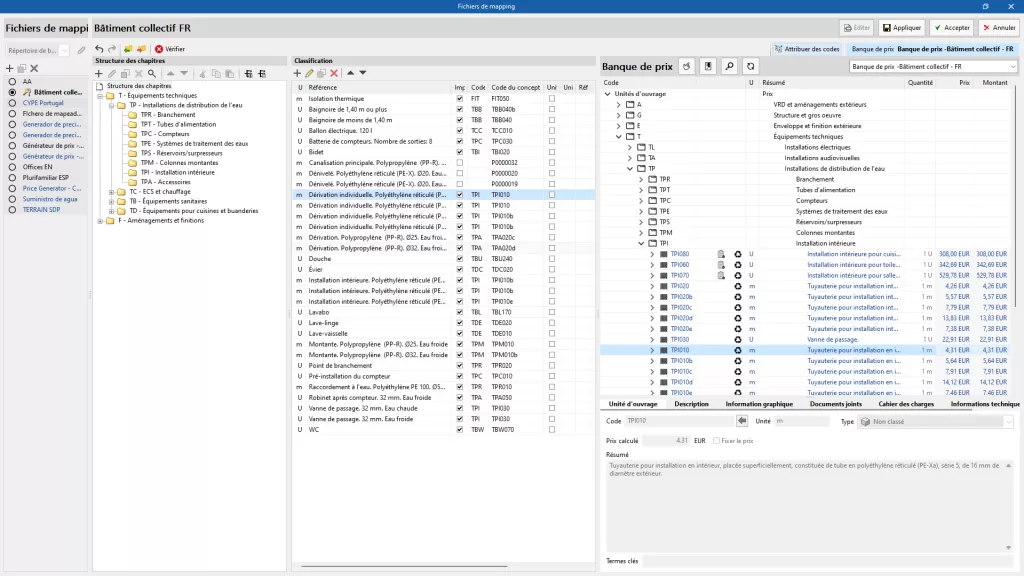 À l'aide du bouton « Chapitres » du panneau « Attribuer des codes », la même structure de chapitres que celle de la banque de prix de référence est automatiquement attribuée au fichier de mappage. Il est également possible de créer la structure manuellement à partir des outils du panneau « Structure des chapitres », en définissant un code et une référence.