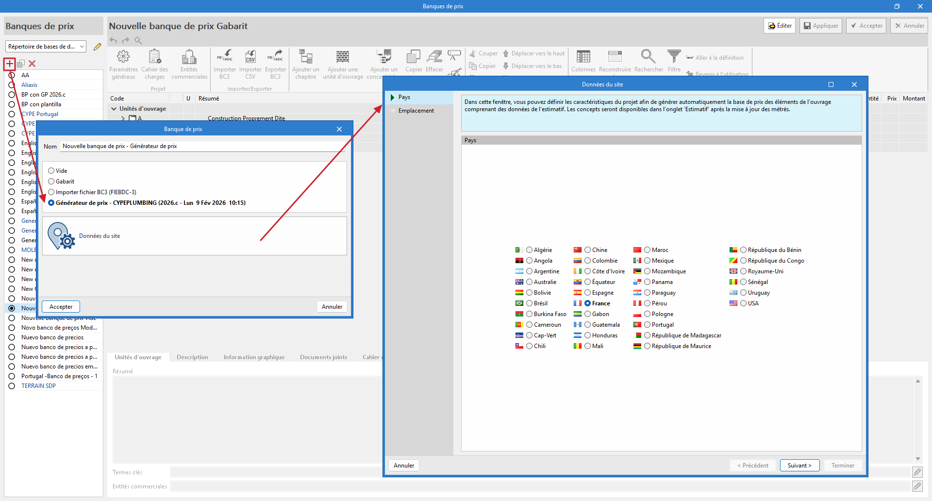 - (Facultatif) Créer une nouvelle banque de prix basée sur les concepts unitaires du « Générateur de prix » pour le pays et le site sélectionnés (uniquement dans certains programmes).