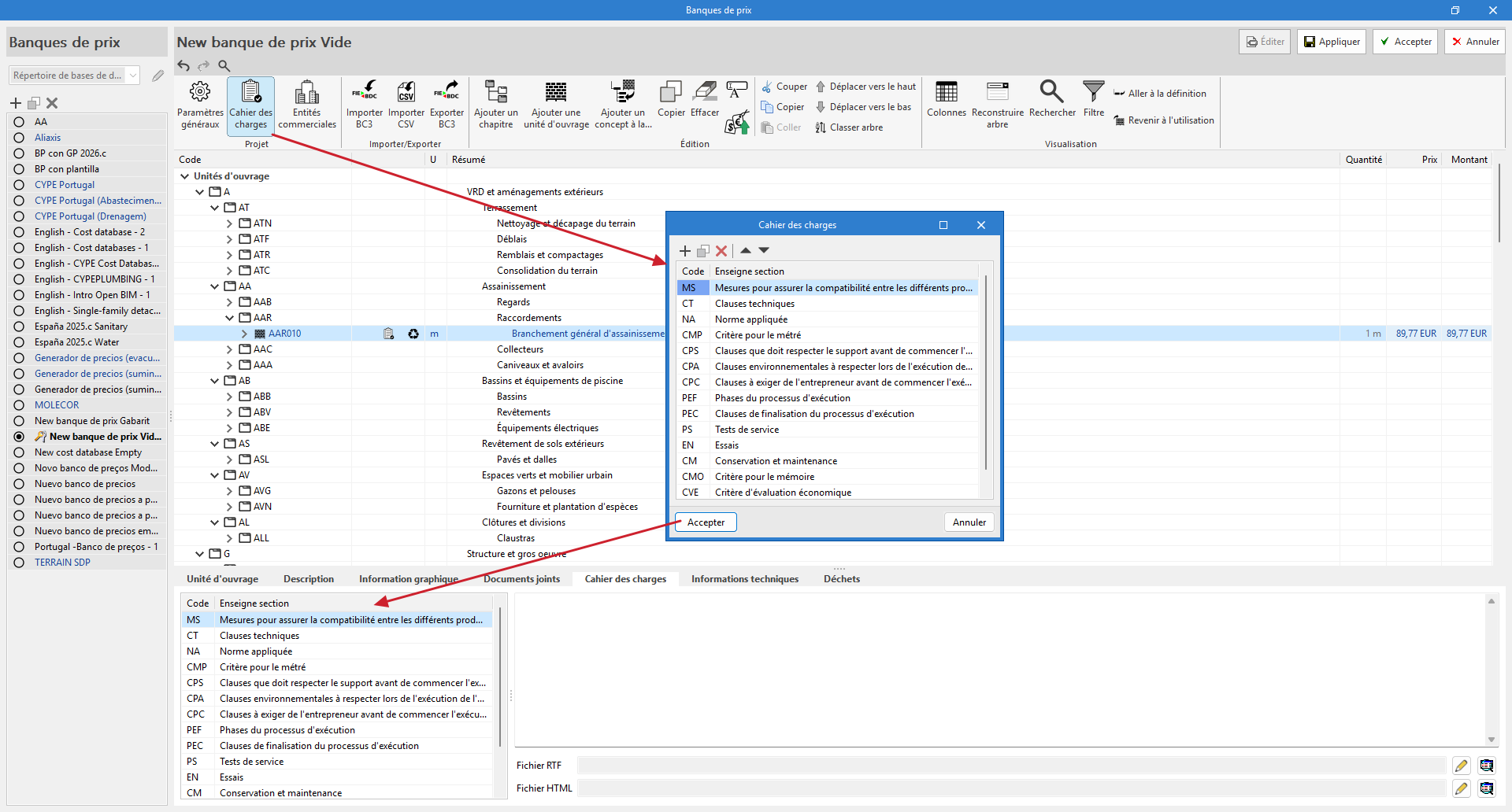 L'application permet d'incorporer une base de données (banques de prix) dans le projet. De nouvelles banques de prix peuvent être créées ou importées à partir de fichiers au format standard FIEBDC-3 (.bc3).