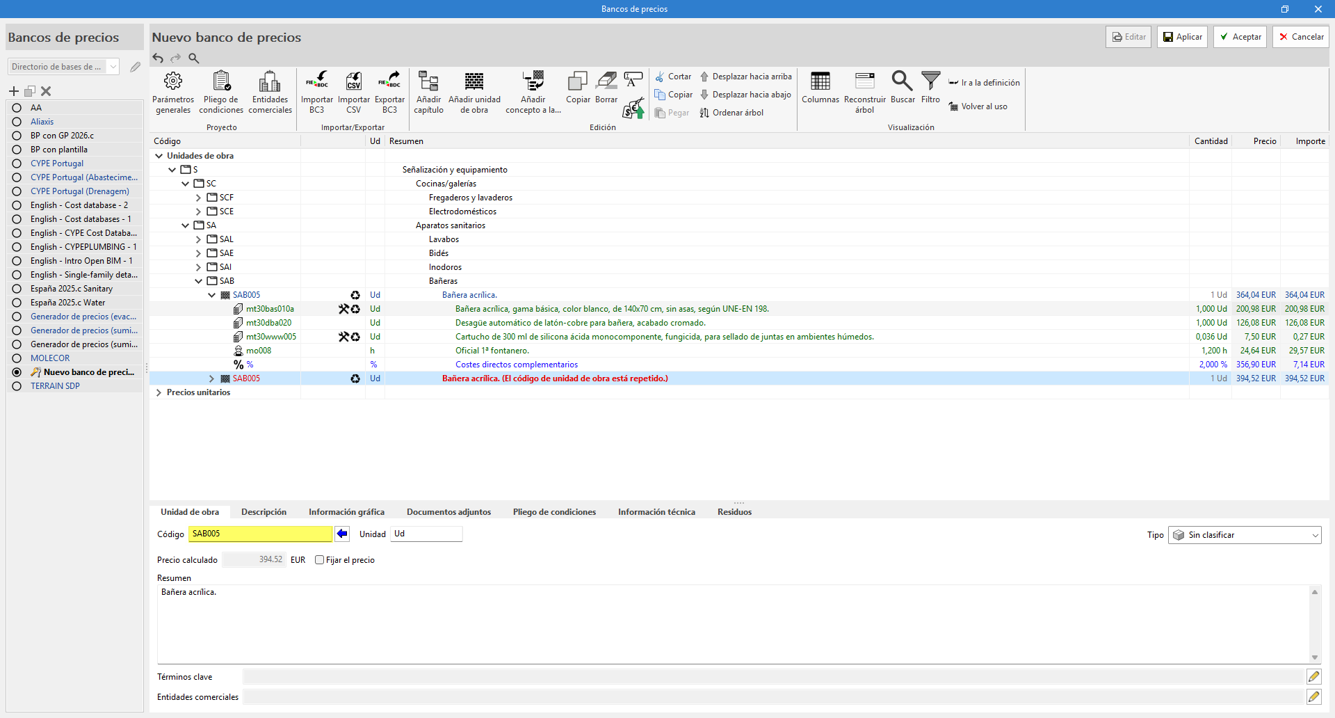 L'application permet d'incorporer une base de données (banques de prix) dans le projet. De nouvelles banques de prix peuvent être créées ou importées à partir de fichiers au format standard FIEBDC-3 (.bc3).