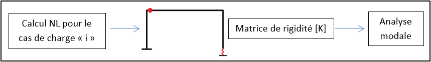 À partir d'un cas de charge, le logiciel effectue une analyse non linéaire de la structure soumise à ces charges. Au dernier échelon de charge, il analyse le comportement des éléments non linéaires et étudie si les non-linéarités sont activées ou non et, dans le cas des rotules plastiques, il analyse si elles se sont formées et dans quel état elles fonctionnent. Le logiciel remplace les éléments non linéaires par leur élément linéaire équivalent et obtient un modèle « linéarisé » équivalent, qui est le modèle de départ pour l'analyse modale qui fournit la matrice de rigidité nécessaire.