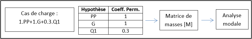 Pour l'analyse modale des vibrations, il peut être considéré qu'à des fins de masse, seules les charges de nature gravitationnelle impliquées dans le cas de charge analysé contribuent et ce, avec les coefficients définis dans la combinaison.