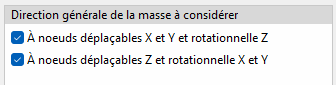 Avec la première option, les masses agissent dans les directions globales à nœuds déplaçables X et Y, et en rotation sur l'axe global Z. Avec la deuxième option, les masses agissent dans les directions globales à nœuds déplaçables Z et en rotation sur les axes globaux X et Y.