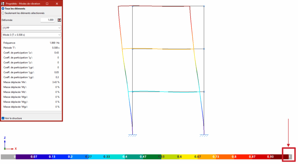 Dans l'analyse modale spectrale, pour chaque hypothèse de tremblement de terre considérée, la forme modale est multipliée par un facteur de mode de sorte que la déformation modale est :