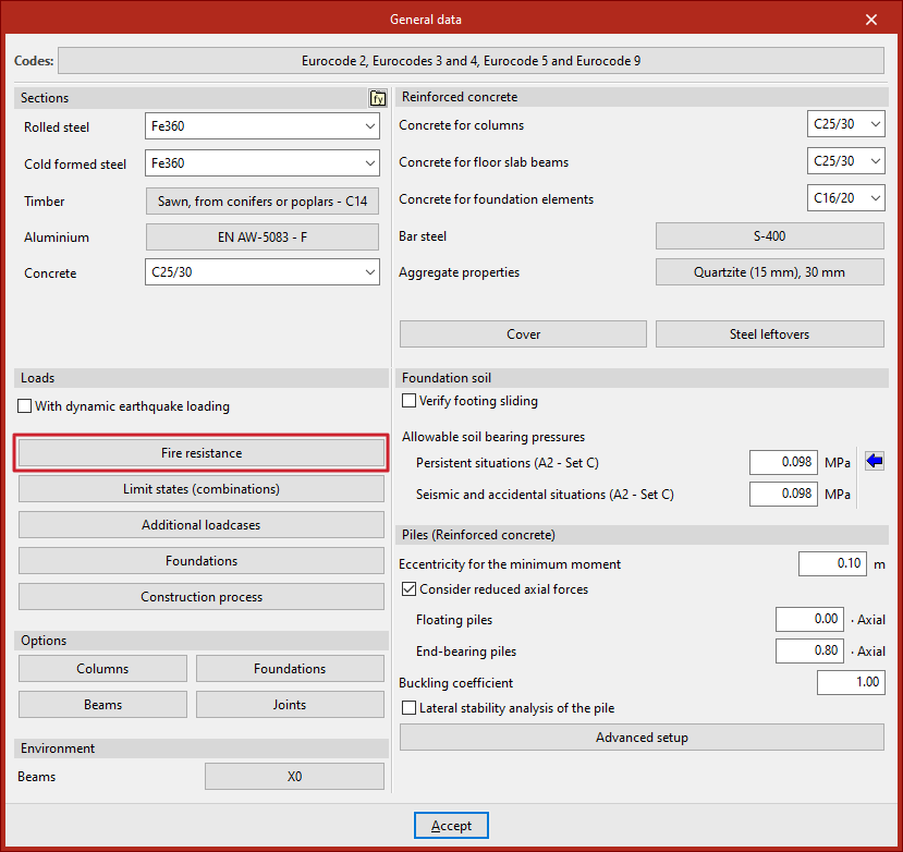 La configuration du contrôle de la résistance au feu s'effectue dans l'onglet ‘Ouvrage’ (accessible depuis l'onglet inférieur ‘Structure’), en sélectionnant l'option ‘Données générales’ du bloc ‘Ouvrage’ de la barre d'outils supérieure.