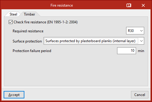 Dans le cas des barres en ‘Bois’, si la case ‘Vérifier la résistance au feu’ est cochée, en plus de la ‘Résistance requise’, la ‘Protection des surfaces’ est définie en la sélectionnant dans le menu déroulant.