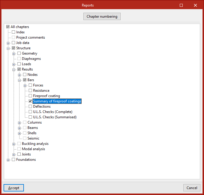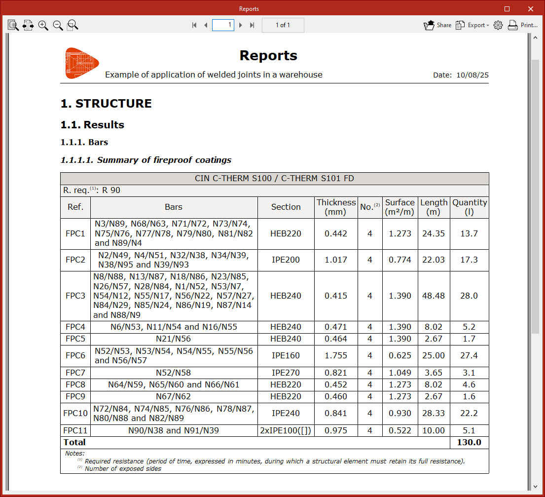 Le récapitulatif ‘Résumé des revêtements ignifuges’, accessible depuis le chapitre ‘Structure’, puis en déroulant ‘Résultats’ et ‘Barres’, comprend un tableau pour chaque produit utilisé avec une indication de la quantité totale de revêtement ignifuge à utiliser.