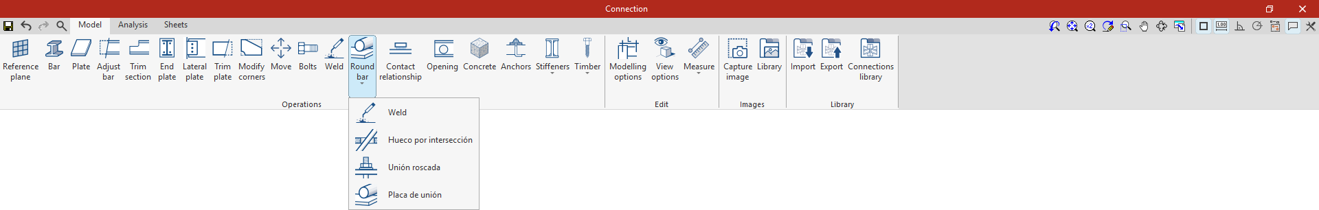 Pour ce faire, dans le bloc ‘Opérations’ de l'onglet ‘Modèle’ de la fenêtre d'édition de chaque assemblage, utilisez le groupement ‘Rond plein’, qui permet d'afficher un menu avec les différentes opérations disponibles.