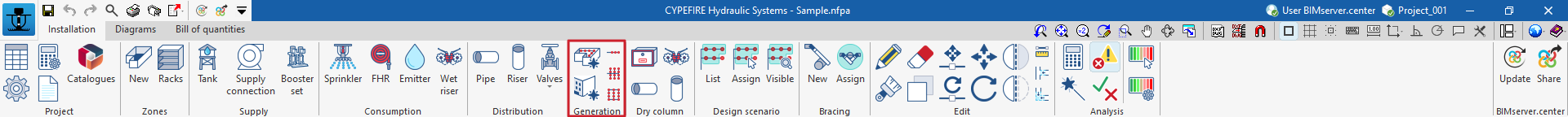 L’option permettant de générer automatiquement des réseaux de distribution d'eau, y compris des tuyauteries et des sprinklers, à partir de la géométrie des zones sélectionnées du modèle, ainsi que les options permettant d'introduire des antennes, des collecteurs avec des antennes et des réseaux maillés complets de manière assistée se trouvent dans l'onglet ‘Installation’, dans le bloc ‘Génération’ de la barre d'outils principale.