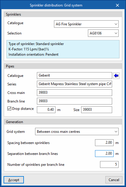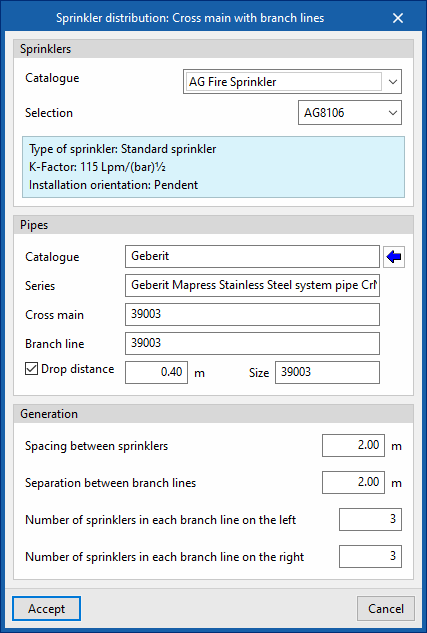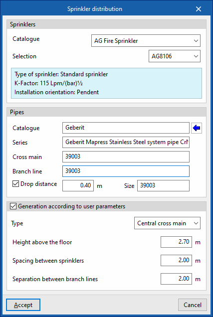 | Pour saisir les sprinklers ou les tuyauteries individuellement, les options correspondantes peuvent être utilisées dans la partie gauche du bloc 'Distribution' et dans le bloc 'Consommations'. |