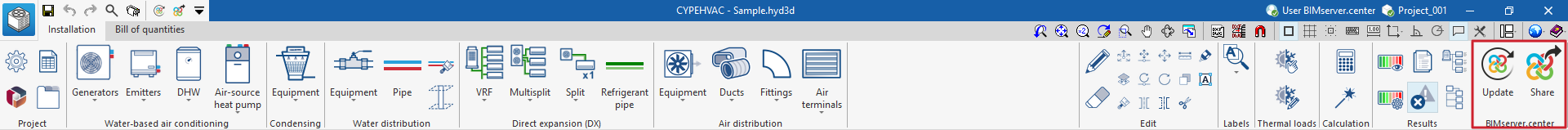 Permet d'exporter les informations de l'installation développée avec CYPEHVAC vers BIMserver.center pour les partager avec d'autres utilisateurs, y compris les récapitulatifs des métrés et le calcul de l'installation.